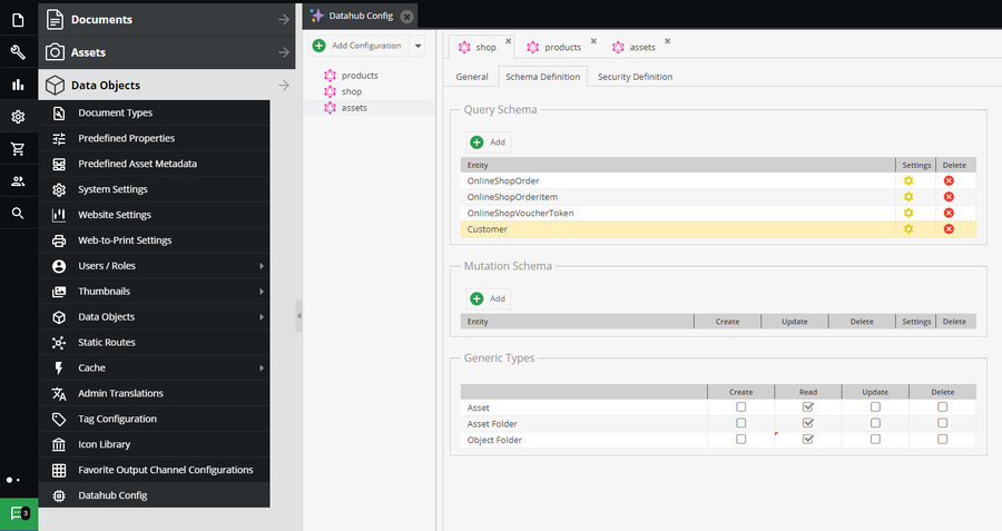 Datahub extension supports Queries and Mutation for Data Objects & Assets.